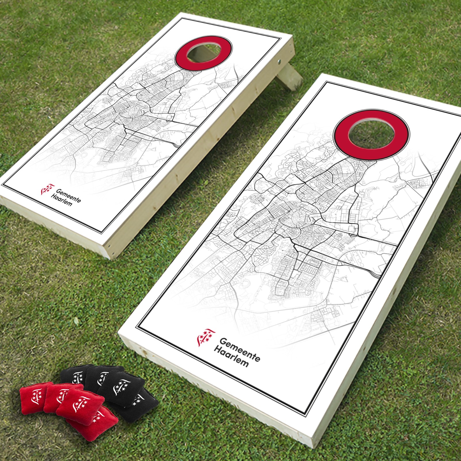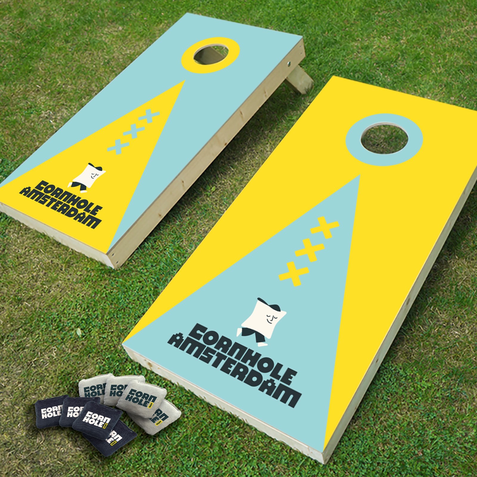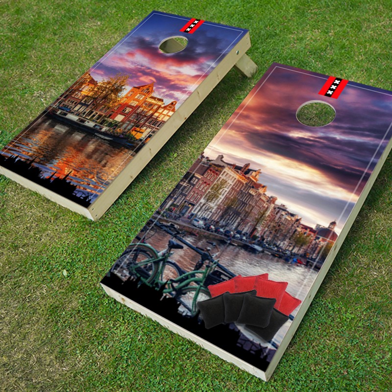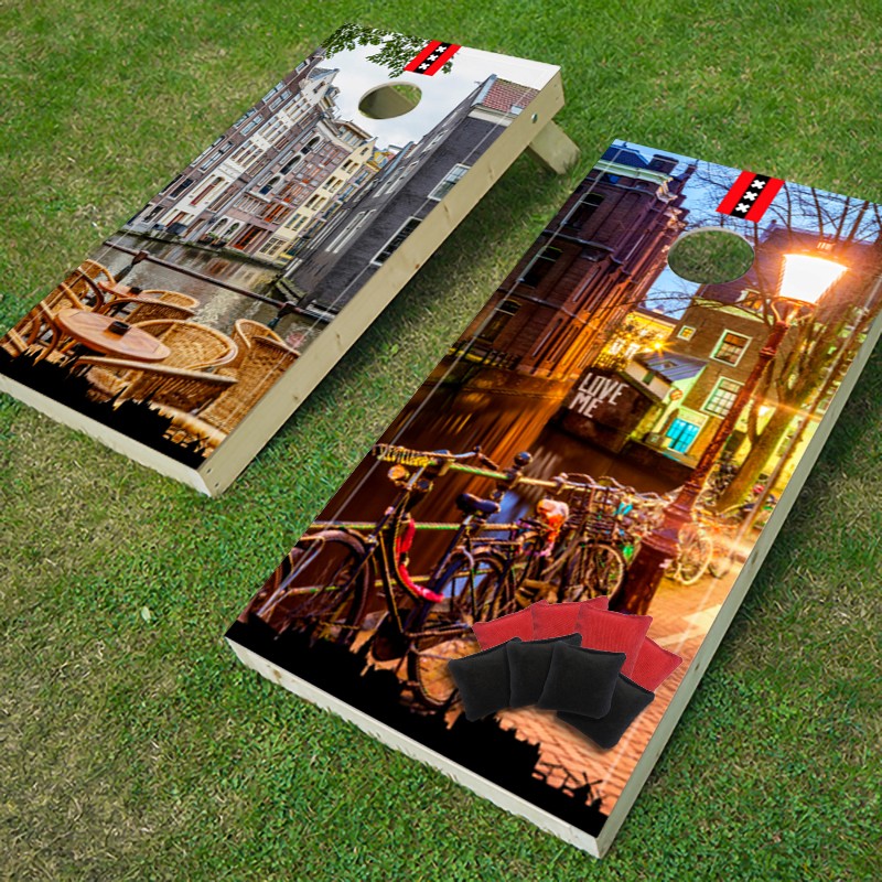 Official Cornhole Amsterdam set: 2 premium boards + 8 bags. Handcrafted, Amsterdam-themed, and ready for outdoor play